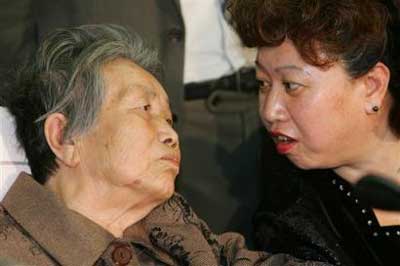 One of 10 Chinese plaintiffs Jing Lanzhi, 83, speaks to her daughter Guo Manli during a press congference in Tokyo Tuesday, April 19, 2005. [AP]