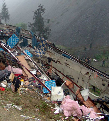 The municipal government of Chongqing demanded that every effort be made to save the lives of the four injured passengers as soon as it learned of the accident. Zhou Mubing, vice-mayor of Chongqing, arrived at Qianjiang as the head of a 400-people task force to deal with the accident's aftermath while a medical team was busy trying to save the lives of the four left alive by the fall, a news release from the district's Work Safety Bureau said. According to Xinhua, the sleeper coach belonged to the Qianjiang branch of Chongqing Transportation Group and was en route from downtown Chongqing to the mountainous Qianjiang District. "The scene of the accident was extremely tragic, with body parts scattered everywhere," said Yang Ke, who was at the site of the accident yesterday. Yang, with the Chengdu-based West China Metropolis newspaper, said it may have happened when the driver attempted to overtake another coach bus at high speeds on a road slick with rain. According to statistics from the Ministry of Public Security, in the first three months of this year, there were 117,220 road accidents nationwide, resulting in 23,411 deaths and 118,887 injuries. The direct economic loss reached 490 million yuan (US$59 million). The number of accidents was down 14.6 per cent, and the death toll down 7 per cent over the same period of last year. And in the first three months, there were 11 serious traffic accidents each leading to the deaths of more than 10 people, in which a total of 232 people died. An accident on February 14 in Guizhou Province of Southwest China killed 15 people. The causes of the road accidents in the first three months, according to the Ministry of Public Security, were mainly drunk driving, the violation of traffic regulations, speeding and exceeding the designated number of passengers. With the approach of spring and the May Day holiday, the number of vehicles on the road is increasing. The Ministry of Public Security has called on related departments at all levels to strengthen surveillance and take every means to eliminate potential risks.