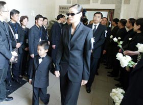 Song Meiying,widow of renowned artist Chen Yifei, walks into a Shanghai funeral parlor with their son yesterday. Some 1,000 people attended a funeral for Chen, who died of liver disease in a local hospital 10 days ago at age 59. [Xinhua]