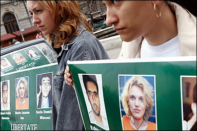 Colleagues and relatives of the three kidnapped Romanian journalists in Iraq display banners with their pictures during a rally in Bucharest's main square demanding their release. [AFP]