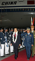Visiting President Hu Jintao (C) is escorted by Air Force Chief Lieutenant General Jose Reyes (R) as he reviews honour guards upon his arrival at the Manila international airport April 26, 2005. Hu is on his first state visit to the Philippines. [Reuters]