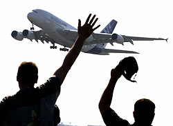 Aviation experts say risks were very slim on the A380 maiden test flight since a plane's aerodynamic characteristics are already well known before it takes off, thanks to years of computer modeling and wind-tunnel tests. Problems are more likely, but still very rare, later in the test-flight program, when the pilots deliberately take the plane to its limits. An Airbus A330 prototype crashed here in July 1994, killing chief test pilot Nick Warner and six others as they conducted a simulated engine failure exercise. The test-flight program is likely to finish before the A380 enters service for Singapore Airlines in mid-2006, Airbus said — about three months behind the previous schedule. Part of the delay is down to the superjumbo's struggle with a weight problem that consumed months of engineering time and most of the program's $1.88 billion in cost overruns. Competitive pressure on airlines to offer plusher business-class seating tightened the squeeze — compounded by the A380's sheer scale. |