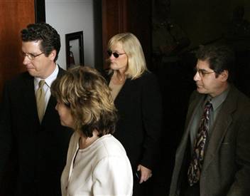 Debbie Rowe, second from right, Michael Jackson's ex-wife and mother of two of his children, leaves the courtroom Wednesday. Rowe tearfully took the stand and described her marriage to the pop star. [AP]