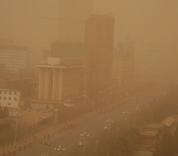 A sandstorm hits Hohhot, capital city of Northeast China's Inner Mongolia Autonomous Region April 28, 2005. The duststorm also affected a wide area in north China, including Beijing. [newsphoto]