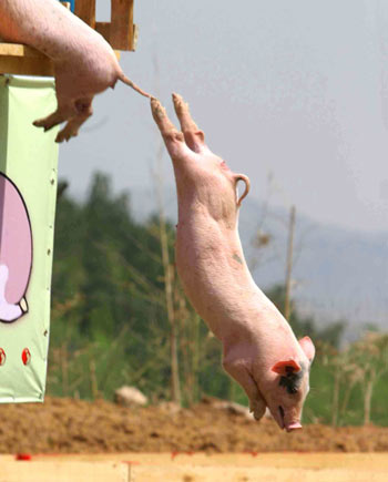 A pig performs diving in a park in Ji'nan, East China's Shandong Province April 28, 2005. As the May Day Holiday draws near, parks in the city are using all kinds of ways to attract visitors. [newsphoto]