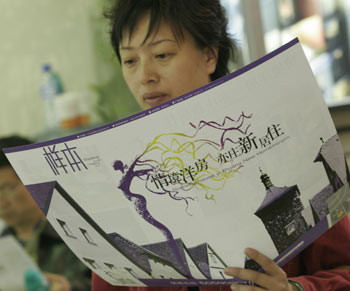 A woman reads housing leaflets at a housing exhibition in Beijing in this picture taken on April 7, 2005. [newsphoto]