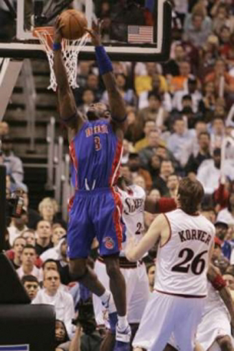 Detroit Pistons center Ben Wallace (3) shoots a reverse dunk in front of the Philadelphia 76ers forward Kyle Korver (26) during the fourth quarter of NBA Playoffs game 3 action in Philadelphia, April 29, 2005. Ben Wallace led the Pistons with 29 points in their 114-104 loss to the 76ers. The Pistons lead the best of seven series two game to one. [Reuters]