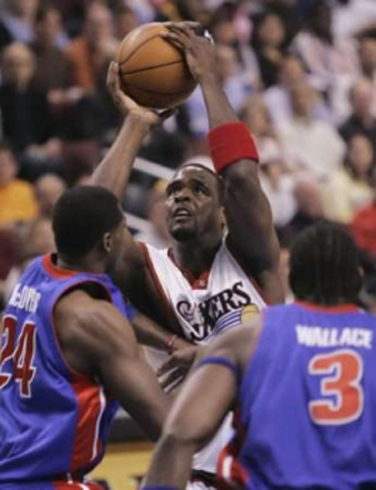 Philadelphia 76ers forward Chris Webber (C) looks to the basket under pressure from the Detroit Pistons forward Antonio McDyess (L) as the Pistons center Ben Wallace (3) follows the play during the second quarter of NBA Playoffs game 3 action in Philadelphia, April 29, 2005. [Reuters]