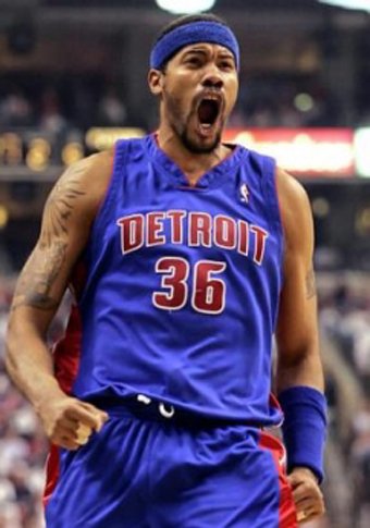 Detroit Pistons' Rasheed Wallace (36) reacts during the first half against the Philadelphia 76ers in Game 3 of their opening-round playoff series Friday, April 29, 2005, in Philadelphia. [AP]