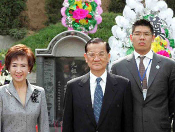 KMT Chairman Lien Chan and wife Lien Fang-yu pay homage to Lien's grandma during a visit to her tomb in Xi'an, Northwest China's Shaanxi Province May 1, 2005. Xi'an is the third leg on Lien's eight-day mainland tour. The 68-year-old Lien was born in Xi'an in 1936 and left the city eight years later. [Xinhua]