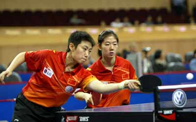 Chinese Guo Yue (L) plays a shot and her partner Niu Jianfeng watches in the women's doubles match against Croatian duo Tamara Boros and Cornelia Vaida at the 48th world table tennis championships in Shanghai May 3, 2005.[Xinhua]