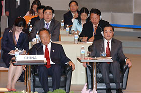 Foreign Minister Li Zhaoxin (L) and Chinese ambassador to Japan Wangyi(R) listen with earphones at the Asia-Europe Meeting in Kyoto March 6, 2005. [Xinhua]