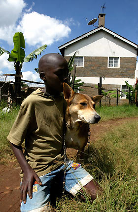 A Kenyan boy named Felix Omondi, 11, holds his dog who rescued a two-week-old
