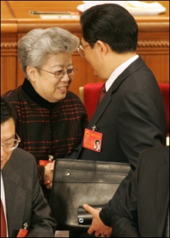 Chinese President Hu Jintao (R) greets Vice Premier Wu Yi. [AFP]