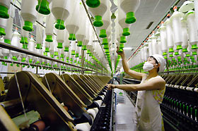 A female worker adjusts the wheels in a textile mill in Huaibei, East China's Anhui Province May 17, 2005. The textile products made here will be exported the US. [newsphoto]