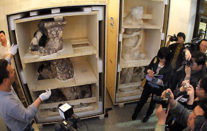 Journalists took pictures at the pieces of cultural relics shipped from Italy to the Shaanxi History Museum for display on April 28, 2005. [newsphoto/file]