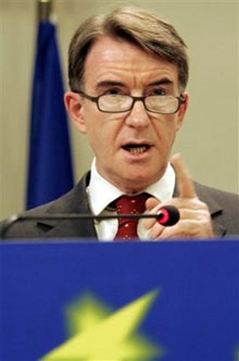 European Commissioner for Trade Peter Mandelson points his finger during a media conference at the European Commission headquarters in Brussels in this May 17, 2005 photo. He said on May 21 at the World Economic Forum in Jordan that the EU has no desire to impose quotas on China's textiles. [AP]