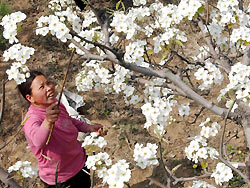 A farmer carries artificial pollination for a pear tree near Zhengzhou, capital of Central China's Henan Province, May 24, 2005. [newsphoto]