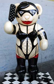 A giant dominatrix teddy bear wearing a leather mask and brandishing