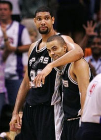 Thanks to Duncan, they're halfway there. And they're heading back to San Antonio, where the Phoenix Suns -- this season's best road team -- will have to deal with a 2-0 series deficit against the NBA's toughest team at home. Duncan scored 25 of his 30 points in the second half and Manu Ginobili and Robert Horry made key baskets in the last 2:33, giving the Spurs a 111-108 victory over the Suns on Tuesday night. Steve Nash and the Suns took it to the buzzer, though, getting a chance to force overtime when Ginobili missed one of two free throws with 4.2 seconds left. Nash took the inbounds pass and raced up the court, getting a step past Tony Parker but being picked up by defensive ace Bruce Bowen just before shooting a 3-pointer on the run. It was on line but short, hitting the front rim to seal Phoenix's first consecutive losses since April 8-9. Suns coach Mike D'Antoni grimaced and Nash walked off blank-faced and spent from playing 46 minutes, comforted in the arms of teammate Jake Voskuhl. "I just tried to stay in front of him," Parker said. The Suns are in an unenviable position: No NBA team has lost Games 1 and 2 of a best-of-seven series at home this deep into the playoffs and still advanced. Four teams have rallied from 0-2 in the conference finals or NBA Finals, but all were headed home for Games 3 and 4. The Spurs are thrilled to be going home, too, as they're 43-4 in San Antonio. The only solace for the Suns is that they won the most road games in the NBA this season and they might have third-leading scorer Joe Johnson back for the next game, on Saturday night. "You never know, especially with these guys," Ginobili said. "The way they shoot, they don't care where they play." Ginobili scored 26 points and Parker had 24 and five assists. Nazr Mohammed had 11, and Horry scored 10, with three 3-pointers. Amare Stoudemire had 37 points and eight rebounds for Phoenix, and Nash had 29 points and 15 assists. He became the first player in playoff history to have four straight 25-10 games, breaking a tie with Oscar Robertson and Michael Jordan.