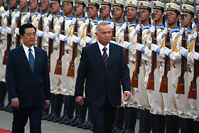 President Hu Jintao and visiting Uzbekistani President Islam Karimov review the honor of guard in Beijing May 25, 2005. [newsphoto]