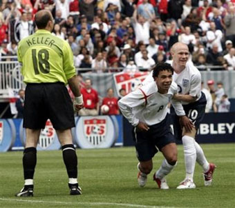 This was the first time the United States and England had played since 1994, when the English won 2-0 at Wembley to avenge a loss in Foxboro, Mass., the year before. Though the English had won five of the teams' first seven meetings — and won handily — this game was by no means a gimme. Not only have the Americans gotten better, advancing to the World Cup quarterfinals of the 2002 World Cup, but England essentially brought its JV team. With the European season just ending and no World Cup qualifier until September, Joe Cole, Ashley Cole and Sol Campbell were the only mainstays in the lineup. David Beckham and Michael Owen are expected to join the team for Tuesday's game against Colombia in New Jersey. The United States wasn't at full strength, either, and the Americans were far more concerned with next week's World Cup qualifiers against Costa Rica and Panama than a friendly. Still, it was England. Except for one group of fans behind the south goal who held up a large American flag and a banner reading "Yank Army Don't Tread on Me," Soldier Field looked more like an English stadium. Banners featuring the English flag and various English teams — Everton, Leicester City and Tottenham Hotspur, just to name a few — covered every spare inch of the walls ringing the field and the first row of seats. And the English didn't disappoint. After Eddie Pope fouled Andy Johnson in the fourth minute, Richardson took the free kick. He made a beautiful curving shot that was just out of reach of diving U.S. goalkeeper Kasey Keller, giving England a 1-0 lead. When the ball settled into the net, Richardson was mobbed by the rest of the English team. He wasn't done, either. In the 44th minute, Pope whiffed as he tried to knock down the ball on a throw-in, and Joe Cole darted in to collect the ball. He made a perfect pass to a wide-open Richardson and, without missing a stride, the rookie took a shot from about the penalty mark and Keller never had a chance as England took a 2-0 lead. The United States blew two chances to score in the first half, both by Landon Donovan. His free kick in the 20th minute banged off the far post, and a perfect shot from about 15 yards out in the 37th sailed wide of the far post. The Americans finally scored in the 79th minute, when Donovan took a free kick and Carlos Bocanegra flicked it while sliding in front of the goal. England goalie David James made a nice kick save, but the ball caromed straight back at Dempsey, who headed it in.