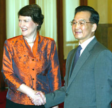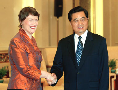Clark said the two countries are facing many opportunities for further co-operation and the FTA agreement is making active progress in a good atmosphere. She said the tiny Pacific nation is also hoping to enhance cultural exchanges with China to promote mutual understanding and friendship between the two peoples. Both sides expressed their willingness to discuss signing a cultural co-operation agreement. Before meeting with Chinese leaders, Clark told reporters she was confident her country and China could agree on a pioneering free trade agreement, but would not set a deadline. "It's going to be an interesting, tough negotiation, but I am confident that China wants it to succeed," she said. Clark said New Zealand wants to become the first developed country to sign a free-trade deal with China but she could not offer an exact date, noting that similar agreements with Singapore and Thailand took about a year to negotiate. She said potential sticking points are China's protection of its growing dairy industry and New Zealand's tariffs on textiles and footwear.