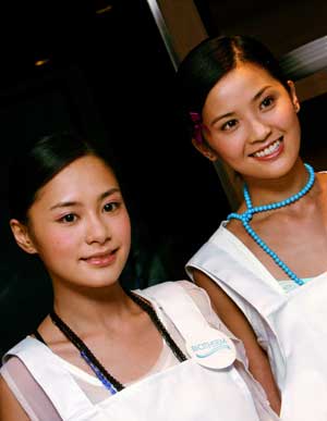 with cosmetics in Hong Kong May 31, 2005. Twins are promoting cosmetic products in