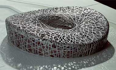 This photo displays a nest-like architecture scheme for the main stadium of the 2008 Olympics. The scheme has been pre-approved by the Beijing public during a design show in Beijing, beating the other two favorites by the smallest margin. The architecture plan, co-designed by Swiss company Herzog & DeMeuron and China Architecture Design Institute, won 3,506 votes for the first place from over 6,00