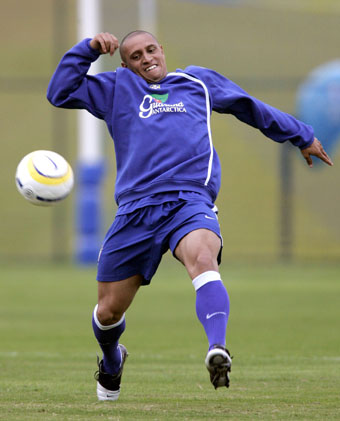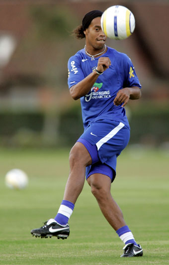 the ball during a training session June 1, 2005. Brazil will face Paraguay