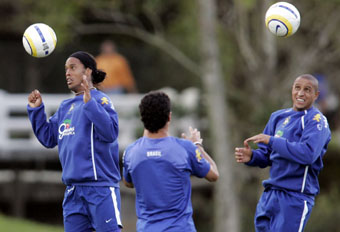 ball during a training session June 1, 2005. Brazil will face Paraguay in