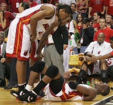 Whether Dwyane Wade can help them take the final step remains to be seen. Wade was injured while taking a charge against Rasheed Wallace in the third quarter, and the pain was too much for him to take when he returned early in the final period of Miami's 88-76 victory over the defending champion Detroit Pistons on Thursday night. The Heat said Wade had a strained rib muscle, and there was no immediate word on his availability for Game 6 at Detroit on Saturday night. Wade scored 15 points and Shaquille O'Neal had 20 for the Heat, who received significant contributions from several players — from some savvy freelancing by point guard Damon Jones in the first and third quarters to two timely turnaround jumpers by Rasual Butler in the fourth quarter — to move as close as the franchise has ever been to making the championship round. But to get there, they'll have to win one final time against a Detroit team that has shown time and again that it's able to take its game to a higher level when circumstances start to turn dire. Miami's Udonis Haslem had his best game of the series with 14 points and 13 rebounds, helping make up for a sub-par offensive effort from Eddie Jones (seven points). Butler contributed 12 points off the bench, including seven in the fourth quarter, and Damon Jones scored 15. Chauncey Billups had 21 points and Richard Hamilton added 19 for the Pistons. Wallace was held to two. Wade went to the locker room after taking a charge from Wallace and straining a rib muscle with 5:08 left in the third period. He returned for the start of the fourth quarter wearing a protective wrap around his midsection, then motioned to the bench that he needed to come out less than 2 minutes into the period. Miami took control in the second quarter by holding Detroit to six field goals and forcing six turnovers in the period. An 11-0 run to close the first half left Miami ahead 53-39, and Detroit trailed by double digits the rest of the way. In NBA history, the winner of Game 5 in a series tied 2-2 has gone on to win it 106 of 126 times. Damon Jones and O'Neal each started 4-for-4 in the first quarter, O'Neal getting his within Miami's halfcourt sets while Jones got his through freelancing. An ill-advised 3-point attempt early in the shot clock ended Jones' 4-for-4 streak late in the period, and he toned down his act through the remainder of the first half and helped keep the Heat steadily in front. Hamilton kept the Pistons within striking range, but with no one else contributing on offense, Detroit had a significant lull. Hamilton's 9-foot bank shot with 2:23 left gave the Pistons their last points of the second quarter, and Miami closed the half with an 11-0 run for the 53-39 lead. Haslem had a wide-open corner jumper and a tip-in to get the lead up to 63-45 early in the third quarter, and a 21-footer by Wade with 5:31 left gave Miami its first 20-point lead, 67-47. Detroit scored the next six points, and Miami coach Stan Van Gundy wanted a timeout when Jones pulled off his next piece of freelancing. Ignoring his coach as he sped over the midcourt line, Jones drove straight to the basket and lofted the ball to O'Neal for an alley-oop dunk. It was a temporary stop to Detroit's comeback, however, as they quickly pulled within 10, but a momentum killer nonetheless. That was as close as Detroit would get, and Miami was able to stay comfortably ahead through the fourth quarter despite being without Wade, who was averaging 30.0 points in the series. Detroit coach Larry Brown finally made a public acknowledgment that he had spoken with the Cleveland Cavaliers about becoming their team president. He again said he would hold off on making any decisions about his future until after the season ends and he addresses a health problem. ... O'Neal led the Heat in scoring for only the second time this postseason.