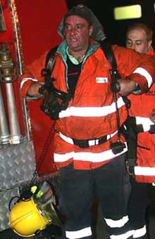 An Italian fire worker removes his equipment after an inspection on the Italian side of the Frejus tunnel between France and Italy, June 4, 2005. At least one person died on Saturday when a truck carrying tyres caught fire in the Frejus tunnel, shutting off a major road under the Alps between France and Italy, Italian officials said. [Reuters]