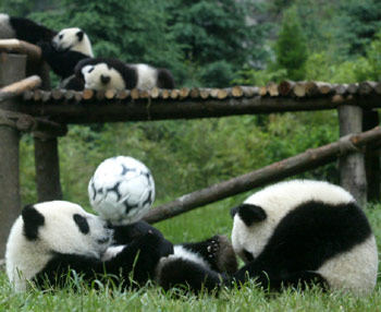 Pandas play soccer in the Giant Panda Breeding Center in South West China's Sichuan Province June 3, 2005. The pair of giant pandas to be sent to Taiwan as gifts will be selected from the center. [newsphoto]