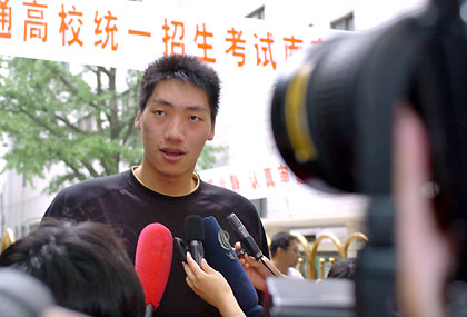 Tang Zhengdong, the Most Valuable Player of the Chinese Basketball Association (CBA) in 03-04 season, walks out walk out of an exam building after finishing the first exam in Nanjing, Jiangsu Province, June 7, 2005. The 212-centimeter-high Jiangsu Tongxi center is the tallest examinee in the Province. [Xinhua] |