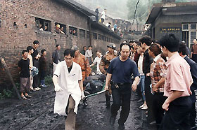 Rescuers rush an injured miner to a hospital after a gas leak at the Zijiang mine in Lengshuijiang, central China's Hunan province, June 8, 2005. [newsphoto]