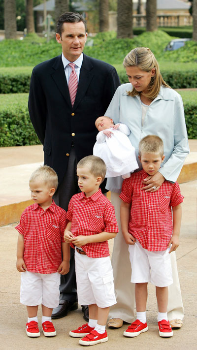 Spain's Princess Cristina (R) and her husband Inaki Urdangarin (L) pose for photographers with their sons Juan (front R), Pablo (front C) and Miguel (front L) and their newborn daugther Irene (C), at Barcelona's Teknon hospital in Spain June 8, 2005. Irene, who was born in June 5, is the first girl after three boys of the Duke of Palma Inaki Urdangarin and Princess Cristina. [Reuters]