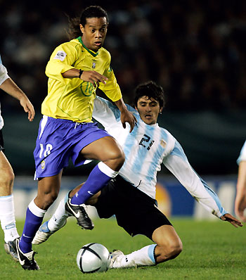 Argentina's Roberto Ayala (R) challenges Brazil's Ronaldinho in the second half their soccer World Cup qualfying match in Buenos Aires, June 8, 2005. [Reuters]