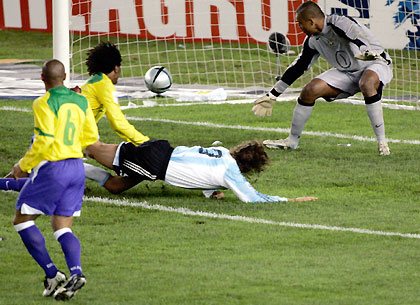Argentina's Hernan Crespo (C) watches as the ball he headed enters the goal to score past Brazil's goalkeeper Dida (R) in the first half their soccer World Cup qualifying match in Buenos Aires, June 8, 2005. Defending the goal are also Brazil's Roque Junior (2nd L) and Roberto Carlos (L). Argentina beat Brazil 3-1. [Reuters]