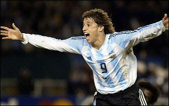 Argentina striker Hernan Crespo celebrates after scoring against Brazil. A brace by Crespo inspired Argentina to a 3-1 victory over their arch-rivals and propelled them into the 2006 World Cup finals.[AFP]