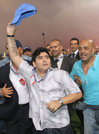 to fans in Naples June 9, 2005. Maradona played with the Naples soccer