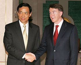 Commerce Minister Bo Xilai (L) shakes hands with the European Trade Commissioner Peter Mandelson as they arrive for trade talks at the Xijiao State Guesthouse in Shanghai, China, June 10, 2005. Mandelson, in Shanghai for last-minute talks with China over its surging textile exports, warned on Friday that the European Union would take action if no deal was reached. [Reuters]