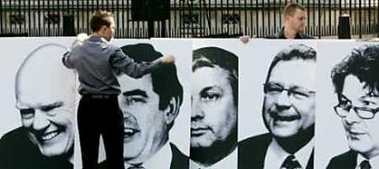 Photographic representations of G8 Finance Ministers including (L to R) John Snow of the U.S., Britain's Chancellor of the Exchequer Gordon Brown, Italy's Dominico Simiscalco, Canada's Ralph Goodale and France's Thierry Breton, are displayed by the Global Call to Action against Poverty group in advance of the ministers' pre-G8 Summit meeting in London June 9, 2005. [Reuters]