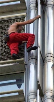 A French urban climber who calls himself "spiderman" scaled a 62-story Hong Kong skyscraper barehanded on Saturday. Wearing only a pair of red pants, Alain Robert, 42, from Valence, southeastern France, scrambled up the downtown Cheung Kong Center — the flagship building of Hong Kong's richest man, Li Ka-shing — in about an hour.