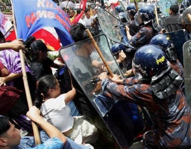 Police push back anti-US protesters trying to march towards the U.S. embassy Saturday, June 11, 2005 in Manila. Police were on the look out for any massing of people a day after a former intelligence officer surfaced and accused President Gloria Macapagal Arroyo cheating in the 2004 election based on a wiretapped conversation. [AP]
