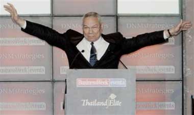 Former U.S. Secretary of State Colin Powell gestures during his speech as a keynote speaker at the Asia Leadership Forum at a hotel in Bangkok, Thailand Monday, June 13, 2005. [AP]