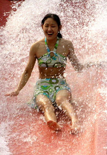 A woman slides down into a swimming pool in the Baihua Park in Jinan, capital city of East China's Shandong Province July 4, 2005. The highest temperature in the city soared to 35 degrees Celsius . [Xinhua]