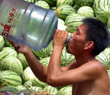 A water melon vendor drinks to cool himself off in a market in Nanjing, East China's Jiangsu Province July 4, 2005. The highest temperature in the city has stayed at 37-38 degrees Celsius for more than a week. [newsphoto]