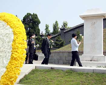 Mu-ming line up to lay flowers at a tomb in memory of fallen soldiers and