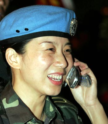 A Chinese peacekeeper talks on a cellphone upon arrival at the Capital International Airport in Beijing July 11, 2005. [newsphoto]